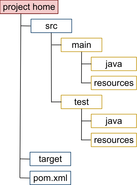 위의 그림은 메이븐(Maven) 프로젝트의 기본 구조를 나타낸 그림이다. 개발 코드는 project home/src/main/java 아래에 있고, 테스트 코드는 project home/src/test/java 아래에 있다. 배포되어야 하는 파일은 project home/target 아래에 있다. 이처럼 각 디렉터리마다 일정한 규칙과 목적을 갖게 프로젝트 구조가 구성됨으로써 '개발 코드 다운로드 후 첫 실행/수정까지의 시간과 노력을 단축'이라는 목표를 이룰 수 있게 되었다.