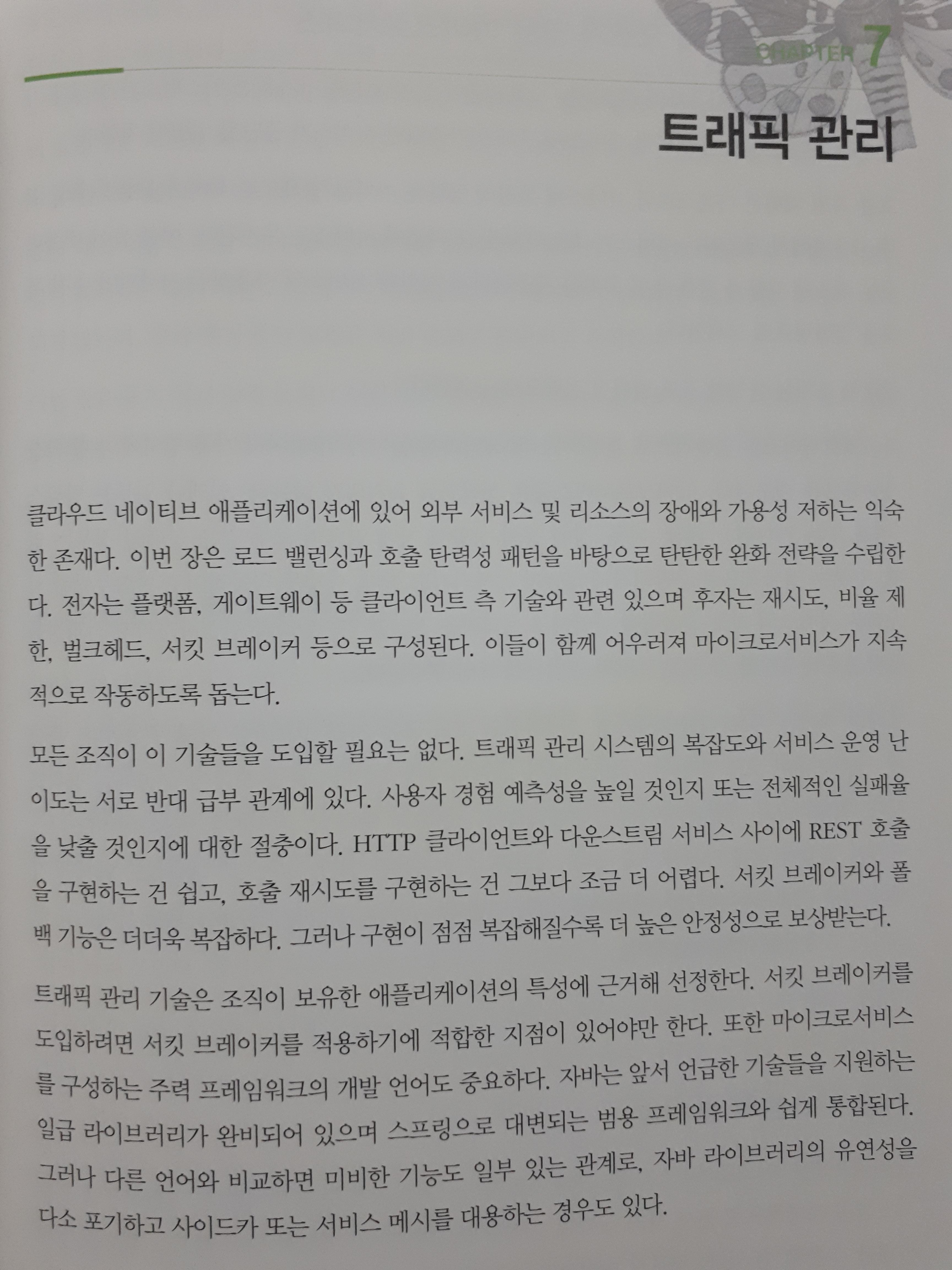 단일 서비스라고 하더라도 그 서비스를 운영하기 위해 지원하는 시스템들이 많다. 여러 모듈이 긴밀하게 동작하기때문에 이 환경을 구성하는것 자체가 서비스보다 더 복잡한 상황이 생기기도 한다. 저자도 같은 경험을 한 것인지 책의 '7장 트래픽 관리'에서 그에 대한 내용을 다루고 있다. 책을 읽어보며 이 장이 책에서 가장 알짜처럼 느껴졌다. 트래픽으로 인한 장애는 서비스가 일정규모 커지지 않는 이상 경험해보기 어렵기 때문이다. 책을 통해서라도 어떤 부분을 고려해야 하는지 힌트를 얻을 수 있었다.