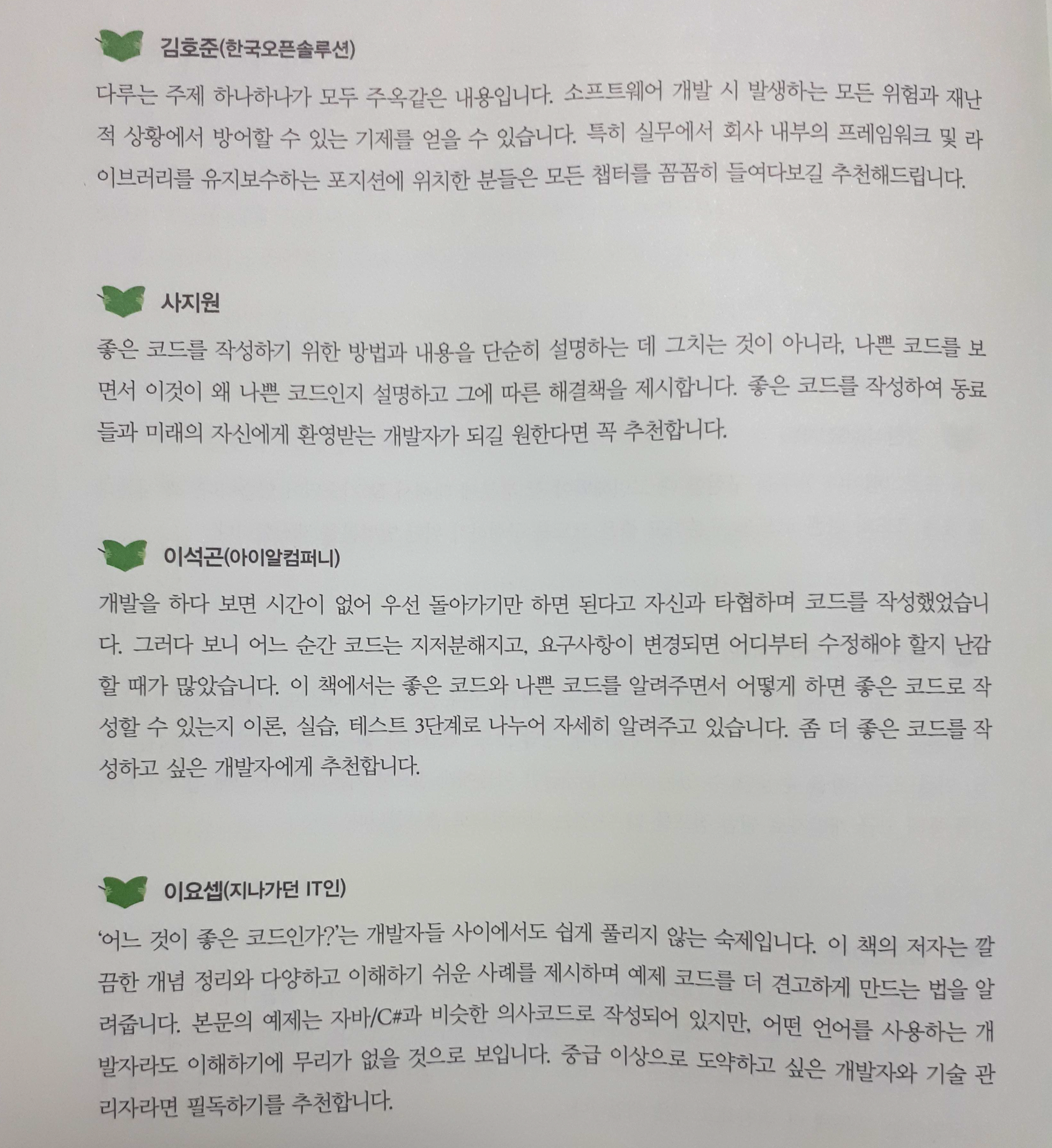 《좋은 코드, 나쁜 코드》는 이 두 영역을 적절히 아우르는 책이다. 1부의 이론에서 좋은 코드와 나쁜 코드 사례를 배우고, 2부에서 코드를 직접 개선해보며 문제점들을 하나씩 해결해보기 때문이다. 마지막 3부에서는 단위테스트를 적용해본다. 개발자로서 실력의 정체기가 온 것 같다면, 성장 속도를 빠르게 하고 싶다면 《좋은 코드, 나쁜 코드》를 읽어보면 좋겠다.