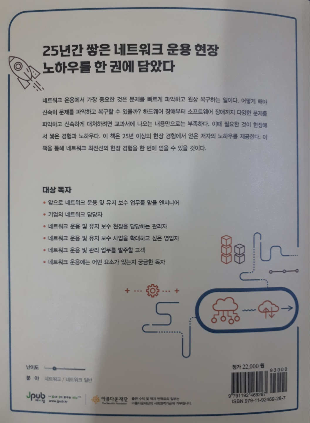 네트워크에 대해 무엇을 공부해야하는지 물어보면 OSI 7계층을 공부하라는 이야기를 많이 듣는다. 물론 OSI 7계층을 공부하는 것이 중요하다. 하지만 네트워크 엔지니어가 되어 실무를 맡을 때는 지금 문제를 일으키는 장애를 해결하고, 정상 상태를 유지하는 것이 중요하다. 《네트워크 운용 및 유지 보수의 모든 것》은 네트워크 엔지니어가 업무를 처리하며 겪는 다양한 상황들을 이미지 트레이닝 할 수 있게 구성되어 있다. 온프레미스 및 클라우드 환경에서 네트워크운용하는 경우 발생가능한 상황은 수 없이 많다. 그래서 《네트워크 운용 및 유지 보수의 모든 것》을 추천한다.