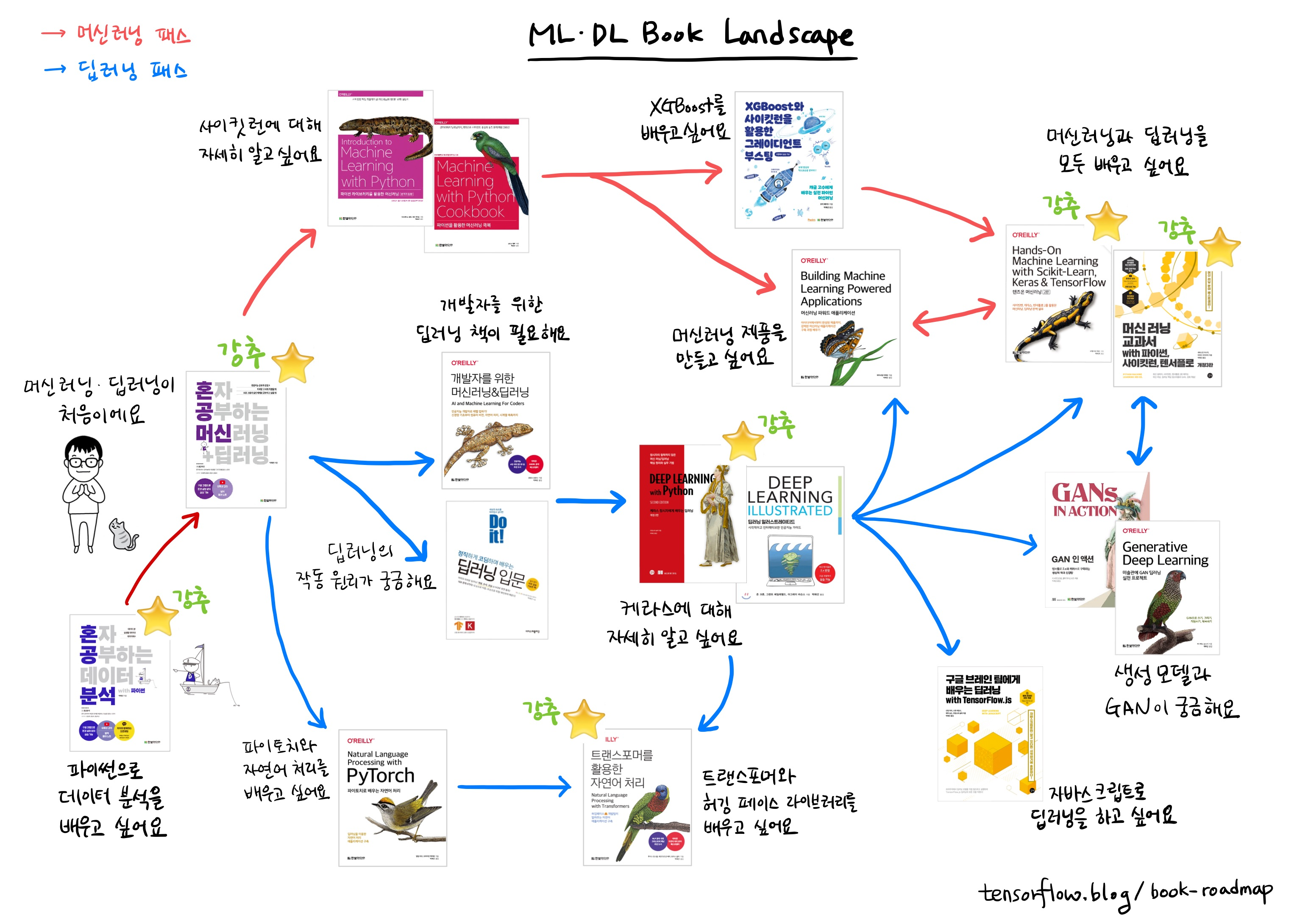 저자가 구성한 커리큘럼 사진을 답변으로 받았다. 이 책들을 모두 저자가 저술하거나 번역한 책이라고 하니 커리큘럼을 믿고 따라가도 되겠다는 생각이 들었다. 《혼자 공부하는 머신러닝 + 딥러닝》도 구매하러 가야겠다.