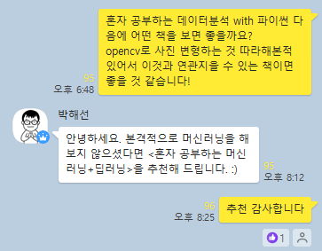 저자가 운영하는 오픈채팅방에서 《혼자 공부하는 데이터 분석 with 파이썬》 다음에 무엇을 공부하면 좋을지 질문했다.