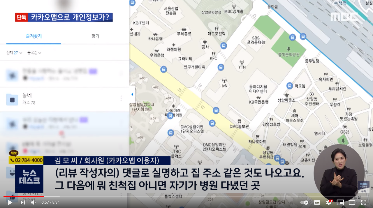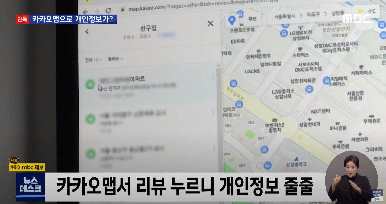MBC 뉴스에 카카오 맵에서 개인정보가 노출된다는 뉴스가 나왔다.