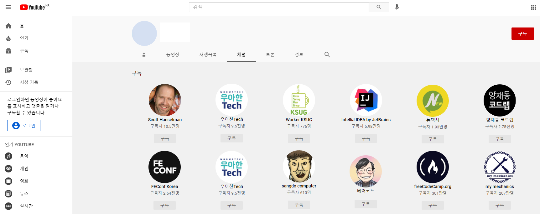 사용자 정보 목록으로 들어가면 사용자가 구독하고 있는 유튜브 채널 목록을 볼 수 있고, 생성해 둔 재생목록도 볼 수 있다.