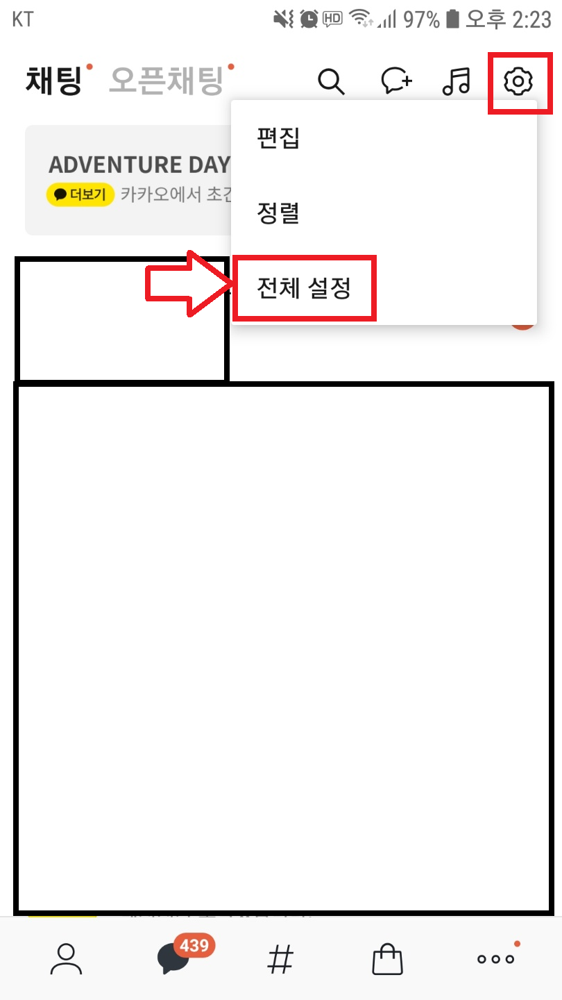 2. 오른쪽 위의 톱니바퀴 누르고 '전체 설정' 메뉴를 누른다