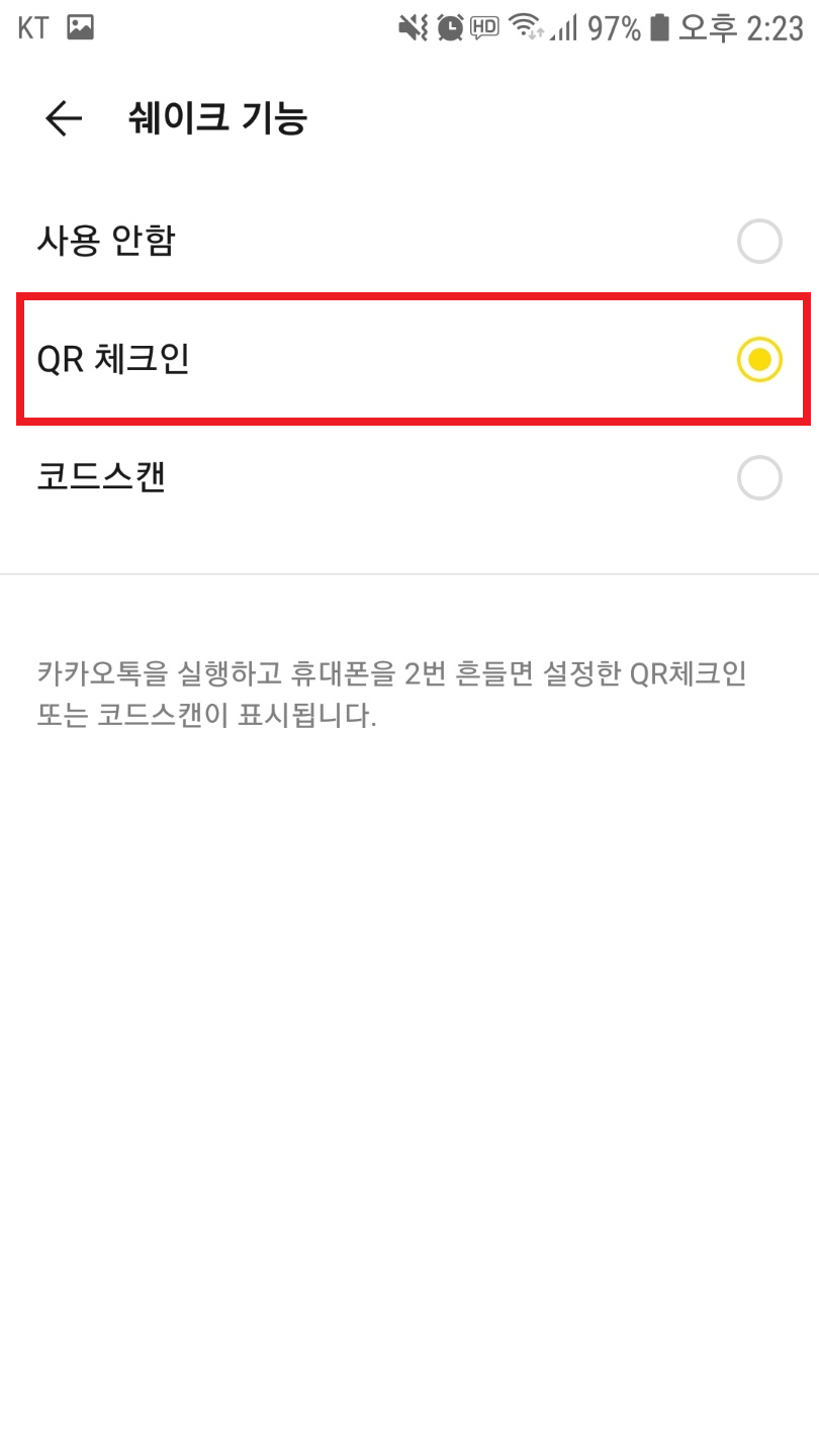 1~5 과정을 정상적으로 마무리했다면 카카오톡이 실행중일 때 스마트폰을 두 번 흔들면 QR코드가 보인다.